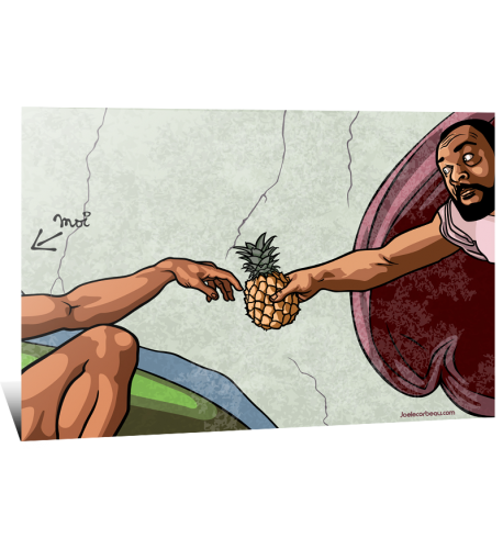 Description : Parodie de la célèbre peinture de Michelange se trouvant à la chapelle Sixtine dans le musé du Vatican, présentant originellement la genèse, Dieu donnant naissance à Adam.